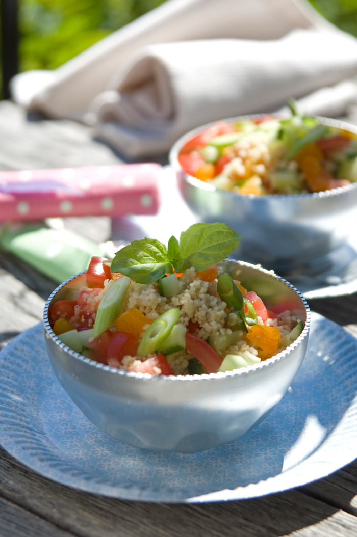 Vend couscous inn i salaten. Olivenolie salt, peber 4 tomater ½ agurk 1 gul peber 75 g spæd salat. Kyllingspyd passer perfekt på tapasbordet eller som middag med en grønn salat, kokt ris og rømmedressing. Du trenger (for 8 pers). Det er et sandt frokosthit, som jeg holder af at servere, hvis vi får gæster til frokost i.